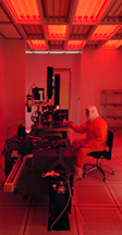Purdue News Service: (765) 494-2096; purduenews@purdue.edu Note to Journalists: Journalists interested in touring the Birck Nanotechnology Center, including the cleanroom suites within the Scifres Nanofabrication Laboratory, can contact Phillip Fiorini at (765) 496-3166, pfiorini@purdue.edu PHOTO CAPTION: A researcher at the Birck Nanotechnology Center works at an optical pattern generator in the Scifres Nanofabrication Laboratory. The instrument, which was donated to Purdue by Raytheon, allows researchers at the Birck cleanroom to pattern intricate shapes on silicon wafers, creating novel devices. The instrument rests on a 4,000-pound granite table in a specially lit lab to protect photo-sensitive images. (Purdue News Service photo/David Umberger)