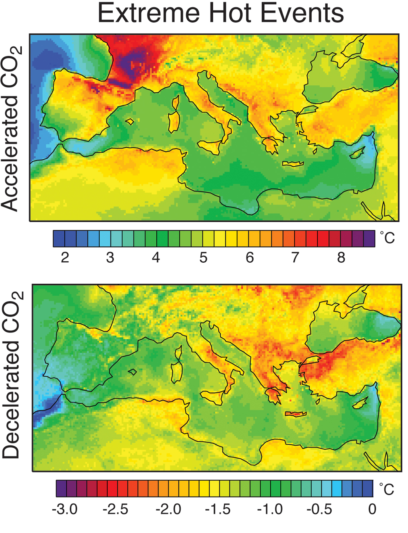 Noah S. Diffenbaugh, Jeremy S. Pal, We find that elevated greenhouse gas concentrations dramatically increase heat stress risk in the Mediterranean region, with the occurrence of hot extremes increasing by 200 to 500% throughout the region. This heat stress intensification is due to preferential warming of the hot tail of the daily temperature distribution, with 95th percentile maximum and minimum temperature magnitude increasing more than 75th percentile magnitude. This preferential warming of the hot tail is dictated in large part by a surface moisture feedback, with areas of greatest warm-season drying showing the greatest increases in hot temperature extremes. Fine-scale topographic and humidity effects help to further dictate the spatial variability of the heat stress response, with increases in dangerous Heat Index magnified in coastal areas. Further, emissions deceleration substantially mitigates heat stress intensification throughout the Mediterranean region, implying that emissions reductions could reduce the risk of increased heat stress in the coming decades.