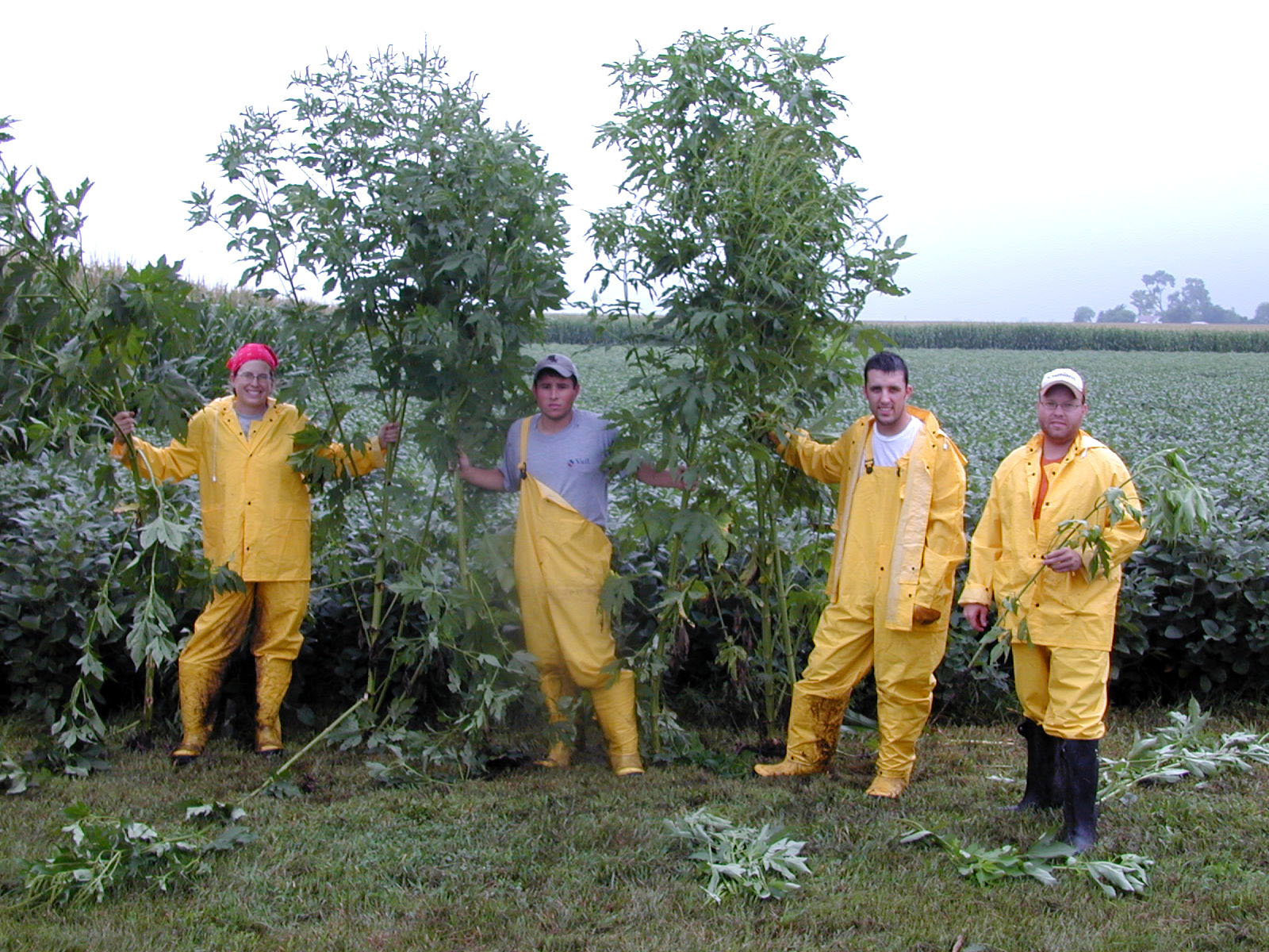 Dawn Nordby, from left, University of Illinois Extension weed specialist, and research assistants Jon Miller, Mike Butler and Phillip Parrish display giant ragweed plants that grew nearly 11 feet tall at the Northern Illinois Agronomy Research Center near DeKalb. The University of Illinois is a member of the Glyphosate, Weeds and Crops Group, which includes Purdue University. (University of Illinois Extension photo/Lyle Paul)