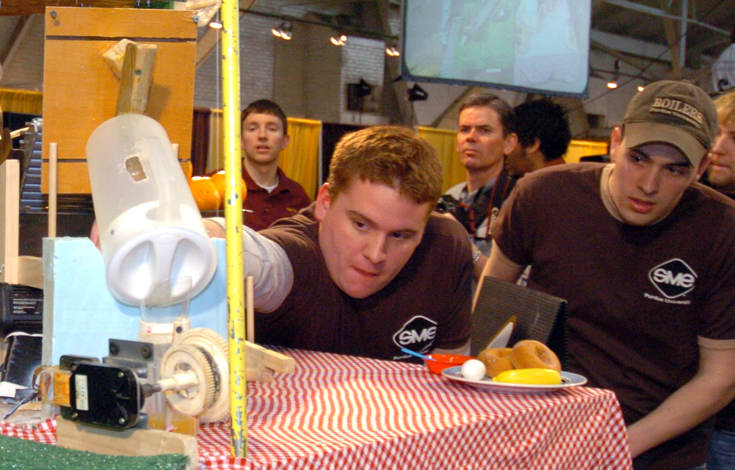 Purdue students Michael Stumpf, from left, Greg Bauman and Drew Wischer celebrate the winning run of their machine on Saturday (Feb. 24) in the regional Rube Goldberg Machine Contest. Their team, the Society of Professional Engineers, claimed its third consecutive regional competition win with a machine that used 134 steps to squeeze juice from an orange into a pitcher and then pour the juice into a glass. The competition, which took place on the Purdue campus, pays homage to the late cartoonist Rube Goldberg, who specialized in drawing whimsical machines with complex mechanisms to perform simple tasks. Stumpf is a junior from Liberty Township, Ohio; Bauman is a freshman from Hoagland, Ind.; and Wischer is a senior from Cedarburg, Wis.