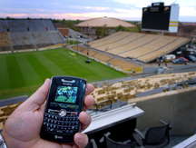 Purdue News Service: (765) 494-2096; purduenews@purdue.edu PHOTO CAPTION: Football fans at Purdue's Ross-Ade Stadium can have video replays in the palm of their hands, thanks to eStadium. The free service allows fans to select and view replays on cell phones equipped with a data plan. eStadium technology behind the scenes prepares the videos within seconds and delivers them in the appropriate format for each device. (Purdue News Service photo/David Umberger) A publication-quality photo is available at https://www.purdue.edu/uns/images/+2007/eStadium.jpg To the News Service home page If you have trouble accessing this page because of a disability, please contact Purdue News Service at purduenews@purdue.edu. |