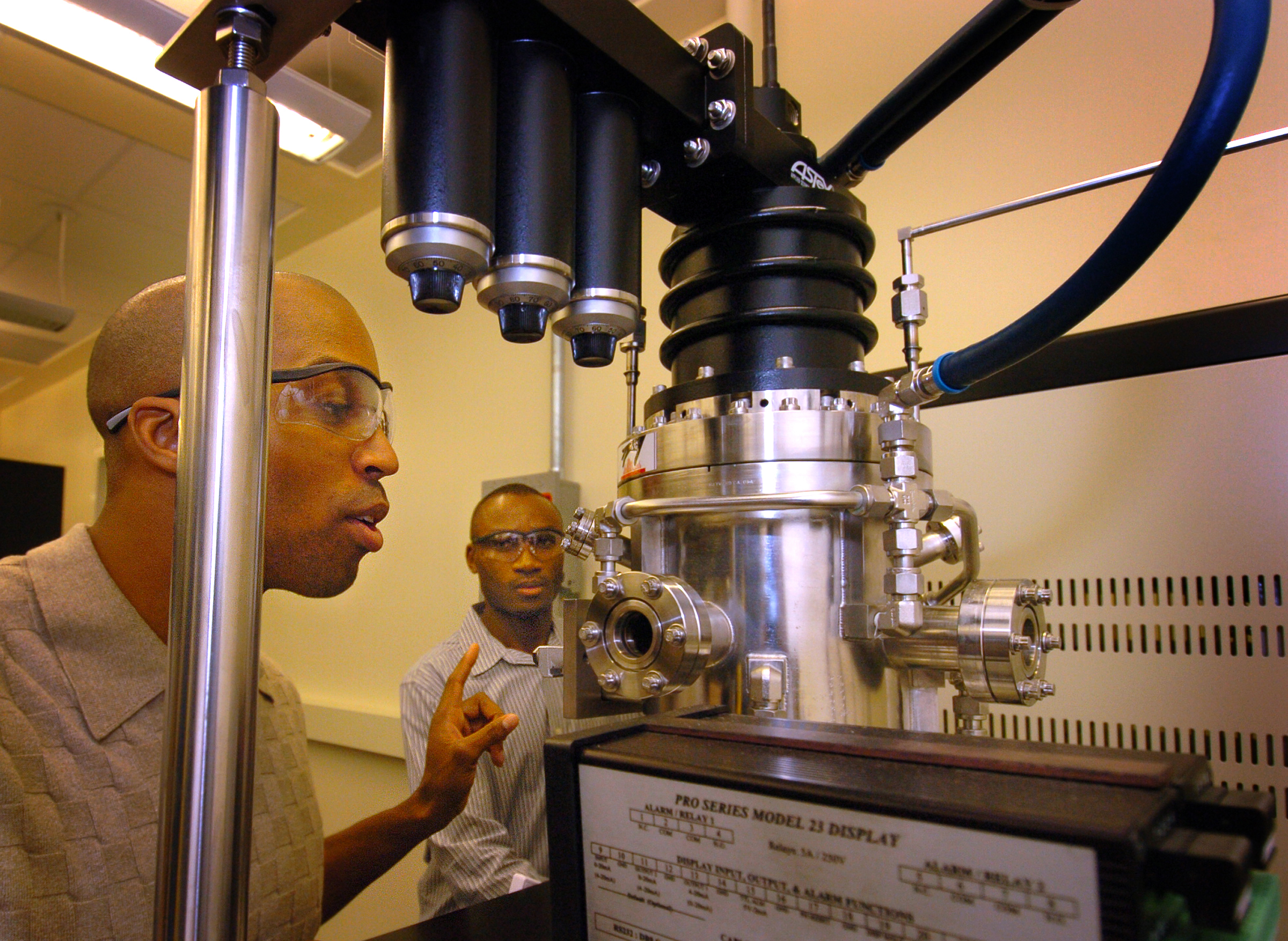 Purdue News Service: (765) 494-2096; purduenews@purdue.edu PHOTO CAPTION: Mechanical engineering doctoral student Baratunde A. Cola, from left, looks through a view port in a plasma-enhanced chemical vapor deposition instrument while postdoctoral research fellow Placidus Amama adjusts settings. The two engineers recently have shown how to grow forests of tiny cylinders called carbon nanotubes onto the surfaces of computer chips to enhance the flow of heat at a critical point where the chips connect to cooling devices called heat sinks. The carpetlike growth of nanotubes has been shown to outperform conventional "thermal interface materials." The research is based at the Birck Nanotechnology Center in Discovery Park at Purdue. (Purdue News Service photo/David Umberger) A publication-quality photo is available at https://www.purdue.edu/uns/images/+2007/amama-chipcooling.jpg Dendrimer-Assisted Controlled Growth of Carbon Nanotubes for Enhanced Thermal Interface Conductance