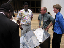 E. Dan Hirleman, the William E. and Florence E. Perry head of the School of Mechanical Engineering, along with students Matt Carroll and Jeff Velker, both of St. Louis, displayed the solar oven technology in September at the Solar Cooking Technology Workshop in Morogoro, Tanzania. Purdue's oven was one of seven demonstrated. Hirleman said Purdue started working on the project this spring with a seed grant from the Shell Oil Co. The design requirements restricted participants to using only materials that could be manufactured and processed in Tanzania. The ovens had to be light enough to be carried on a bicycle, last 10 years or more, reach temperatures of at least 270 degrees, be large enough to hold two 2.5-quart pots and cost $30 or less. Since $30 is equal to the average monthly wage in Tanzania, the Purdue team looked at ways to make the oven as inexpensive and lightweight as possible while using a design that reflected local cultural practices. "I supervised a senior design team this summer whose prototype was quite successful," Hirleman said. "A generous donation from alumnus Ken Decker allowed two of our students to travel with me to Tanzania, make the presentation and meet with potential users, manufacturers and suppliers for the Purdue oven." Decker, of Lafayette, Ind., is a 1964 mechanical engineering graduate. He is a patent attorney who does consulting work and, with his wife, Kitty, have established scholarships for Purdue students in many areas. "Exploiting solar energy is critical for Tanzania," said Finias B. Magessa, executive secretary of the Tanzanian Solar Energy Association, who attended the workshop. "The Purdue team constructively contributed towards helping solar cooking to penetrate the poorest regions of our country." The Purdue design team focused its model on heat transfer, computational fluids, sensors, materials and manufacturing processes. Purdue's design used recycled lithographic newspaper printing plates for the solar reflectors. The team also developed a polishing method for those plates, designed hinges from recycled nails and metals that could be routinely manufactured in Tanzania, and fabricated seals from recycled tennis shoes. "Entrepreneurship will be critical to infusion of this clean technology into Tanzania," said Linus C. Gedi, an agrifood specialist of the Small Industries Development Organization of Tanzania. "I was pleased to see the Purdue students include economic and cultural factors in their design to the extent that their concepts will be quite helpful in building a set new micro-enterprises." Tanzania officials have said the need for firewood, charcoal and other biomass for cooking has not only decimated the country's forest cover, but also led to a large number of related deaths. "I knew the health implications of cooking indoors with charcoal were dire," Hirleman said. "But I didn't realize until the workshop that, according to the World Health Organization, deaths attributable to smoke inhalation from biomass fires for cooking are greater than malaria, roughly equal to tuberculosis and about half that of HIV/AIDS. So if solar ovens like the one our seniors designed can become routinely used, it will save lives in Tanzania and neighboring countries." The School of Mechanical Engineering serves more than 1,250 undergraduate and graduate students and has extensive facilities that include two major satellite research laboratories, the Ray W. Herrick Laboratories and the Zucrow Laboratories (formerly the Thermal Sciences and Propulsion Center), and more than 30 additional instructional and research laboratories. In addition, a comprehensive computing system environment, libraries and technical services support the school. Writer: Clyde Hughes, (765) 494-2073, jchughes@purdue.edu Source: E. Dan Hirleman, (765) 494-0539, hirleman@purdue.edu