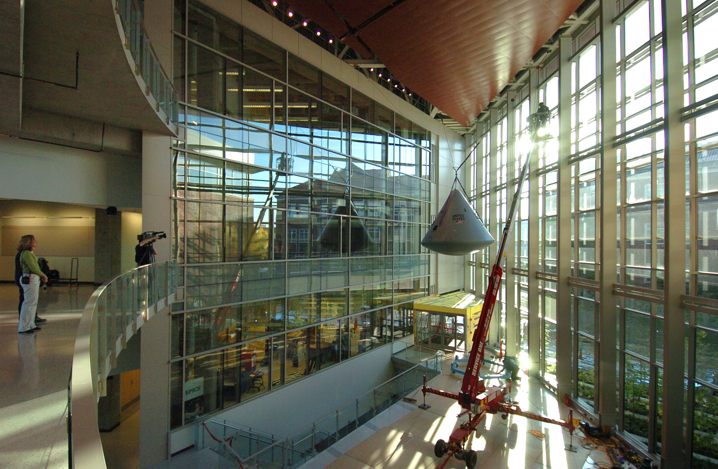 Workers move a full-scale replica of the Apollo 1 command module into place inside the atrium of Purdue's Neil Armstrong Hall of Engineering on Wednesday (Oct. 17). The capsule, on loan from the Kansas Cosmosphere and Space Center in Hutchinson, Kan., will be on display during the hall's official dedication on Oct. 27. In 1967 two of the Apollo 1 astronauts, Purdue graduates Virgil "Gus" Grissom and Roger Chaffee, died in a fire during a launch pad training exercise in the capsule. Construction is complete on Purdue's $53.2 million Neil Armstrong Hall. Armstrong, the first man to walk on the moon, will be honored with a series of events, including the dedication of the new building at his alma mater, on Oct. 26-Oct. 27. A bronze sculpture of Armstrong as a college student will be unveiled on Oct. 26. Leading away from the statue are moon boot impressions reminiscent of Armstrong's historic lunar excursion. (Purdue News Service photo/David Umberger)