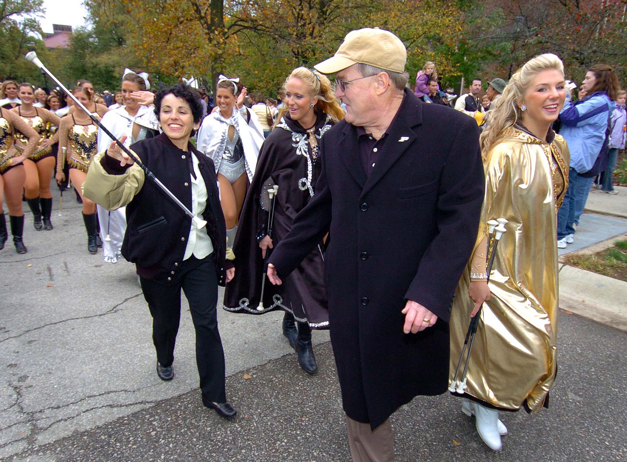 Purdue President France A. Córdova tries her hand at twirling with the baton of Girl in Black, Tierney Brown, during Saturday's (Oct. 27) Homecoming festivities. First Gentleman Chris Foster and Golden Girl Meghan Lamontagne (far right) look on as Córdova leads the twirling team, band and alumni to the stadium for the kickoff of the Homecoming game against Northwestern. The Boilermakers defeated the Wildcats 35-17. (Purdue News Service photo/David Umberger)