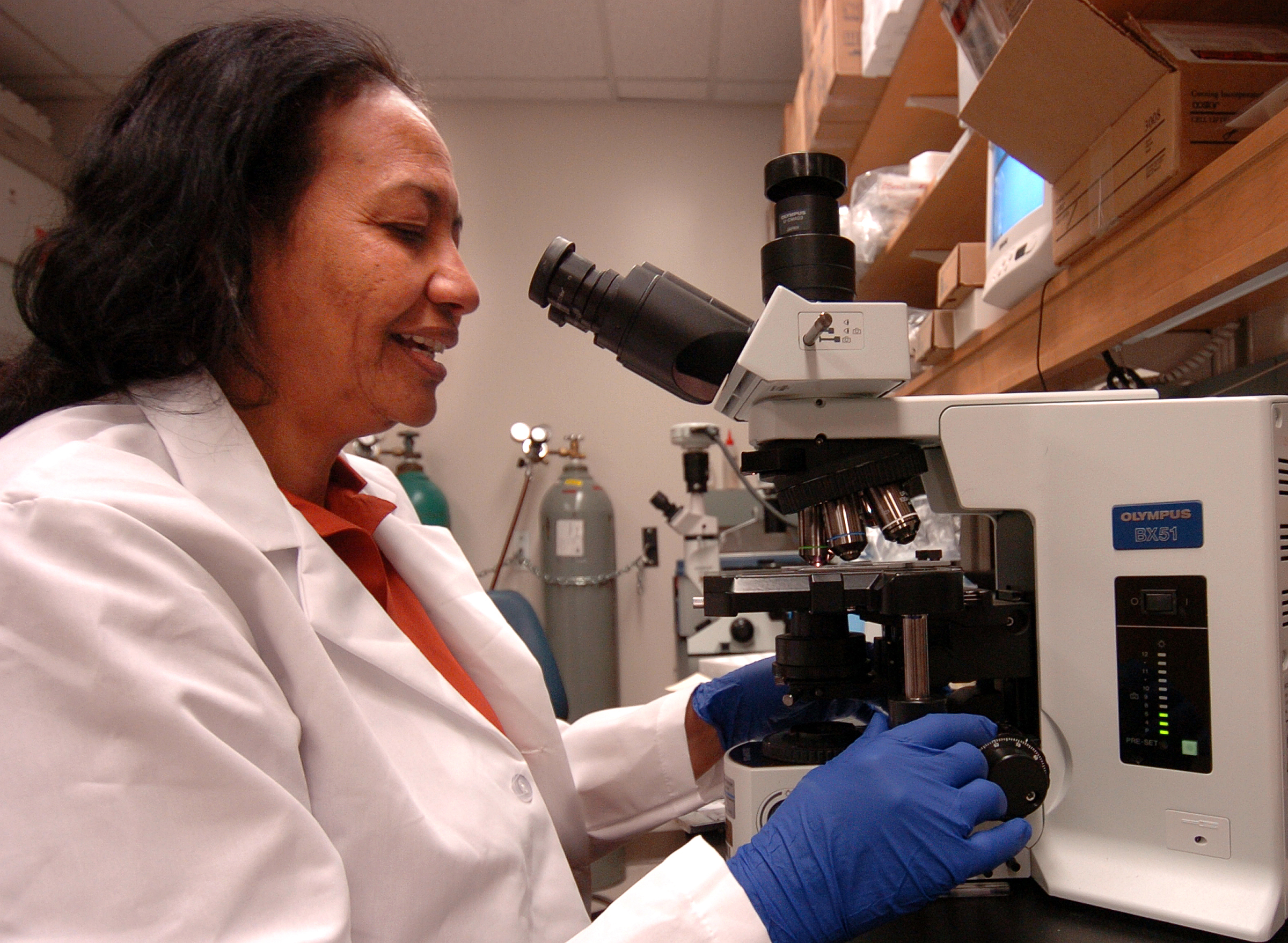 Purdue News Service: (765) 494-2096; purduenews@purdue.edu PHOTO CAPTION: Sulma Mohammed, associate professor of cancer biology in Purdue's School of Veterinary Medicine, looks at tissue samples to find similarities between canine and human lesions associated with breast cancer. A Purdue study found that dogs make an ideal model to study progression of the disease while it is still treatable. (Purdue News Service photo/David Umberger) A publication-quality photo is available at https://www.purdue.edu/uns/images/+2007/mohammed-breastcancer.jpg