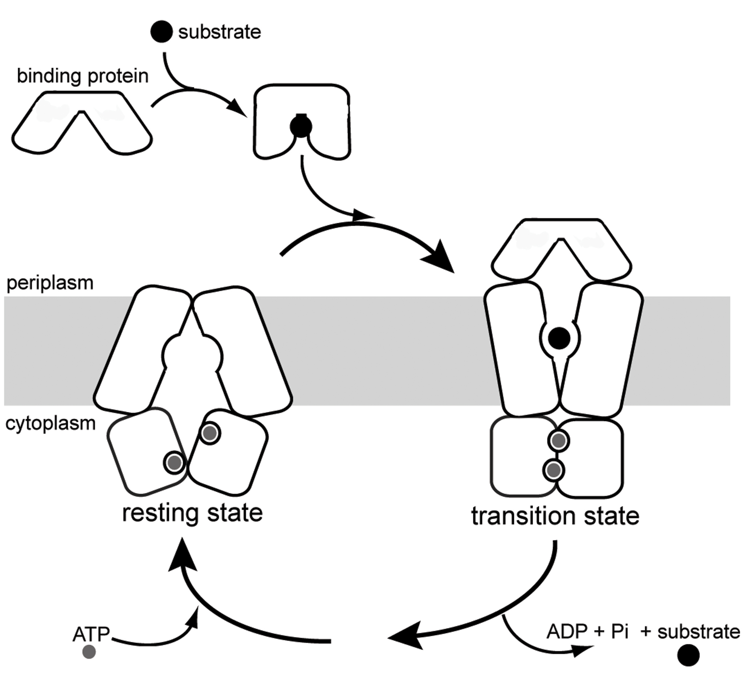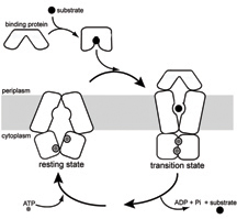 Michael L. Oldham, Dheeraj Khare, Florante A. Quiocho, Amy L. Davidson & Jue Chen The maltose uptake system of E. coli is a well-characterized member of the ATP-binding cassette transporter superfamily. Here we present the 2.8A crystal structure of the intact maltose transporter in complex with the maltose-binding protein, maltose and ATP. This structure, stabilized by a mutation that prevents ATP hydrolysis, captures the ATP-binding cassette dimmer in a closed ATP-bound conformation. Maltose is occluded within a solvent-filled cavity at the interface of the two transmembrane subunits, about halfway into the lipid bilayer. The binding protein docks onto the entrance of the cavity in an open conformation and serves as a cap to ensure unidirectional translocation of the sugar molecule. These results provide direct evidence for a concerted mechanism of transport in which solute is transferred from the binding protein to the transmembrane subunits when the cassette dimmer closes to hydrolyse ATP.