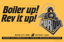 The 11-inch by 17-inch gold and black poster reads: "Boiler up! Rev it up!" "We wanted to provide the fans with an appropriate poster to express school spirit and pride," said David Brannan, director of Purdue Marketing Communications. Brannan's staff designed the posters, which are sponsored by the offices of University Relations and Athletic Public Relations. The free posters are available to fans between 8 a.m. and 5 p.m. at these campus locations: Mackey Arena, Room 60; Purdue's Visitor Information Center, 504 Northwestern Ave.; the Purdue Marketing Communications office, South Campus Courts-D; and the Purdue Alumni Association office, located in the Dick and Sandy Dauch Alumni Center. The Visitor Information Center also is open from 8 a.m. to noon on Saturdays. The Boilermakers (7-5, 3-5 Big Ten) will face the Central Michigan Chippewas from the Mid-American Conference. Central Michigan has an 8-5 overall record, including a 35-10 victory over Miami (Ohio) in the MAC championship game at Ford Field. Purdue and Central Michigan met earlier this season, with the Boilermakers posting a 45-22 victory at Ross-Ade Stadium on Sept. 15. The teams are scheduled to meet again in West Lafayette on Sept. 13, 2008. Head coach Joe Tiller will take his 10th Purdue team to postseason play in 11 seasons. This is the Boilermakers 15th bowl game in school history. Tickets are priced at $45 and $60 each and can be ordered through the Purdue Athletic Ticket Office by phone (494-3194 or 800-49-SPORT) or online at https://www.purduesports.com. For information on tickets, tour packages, apparel and merchandise, plus other information about the Motor City Bowl, fans can call (888) 471-3027.