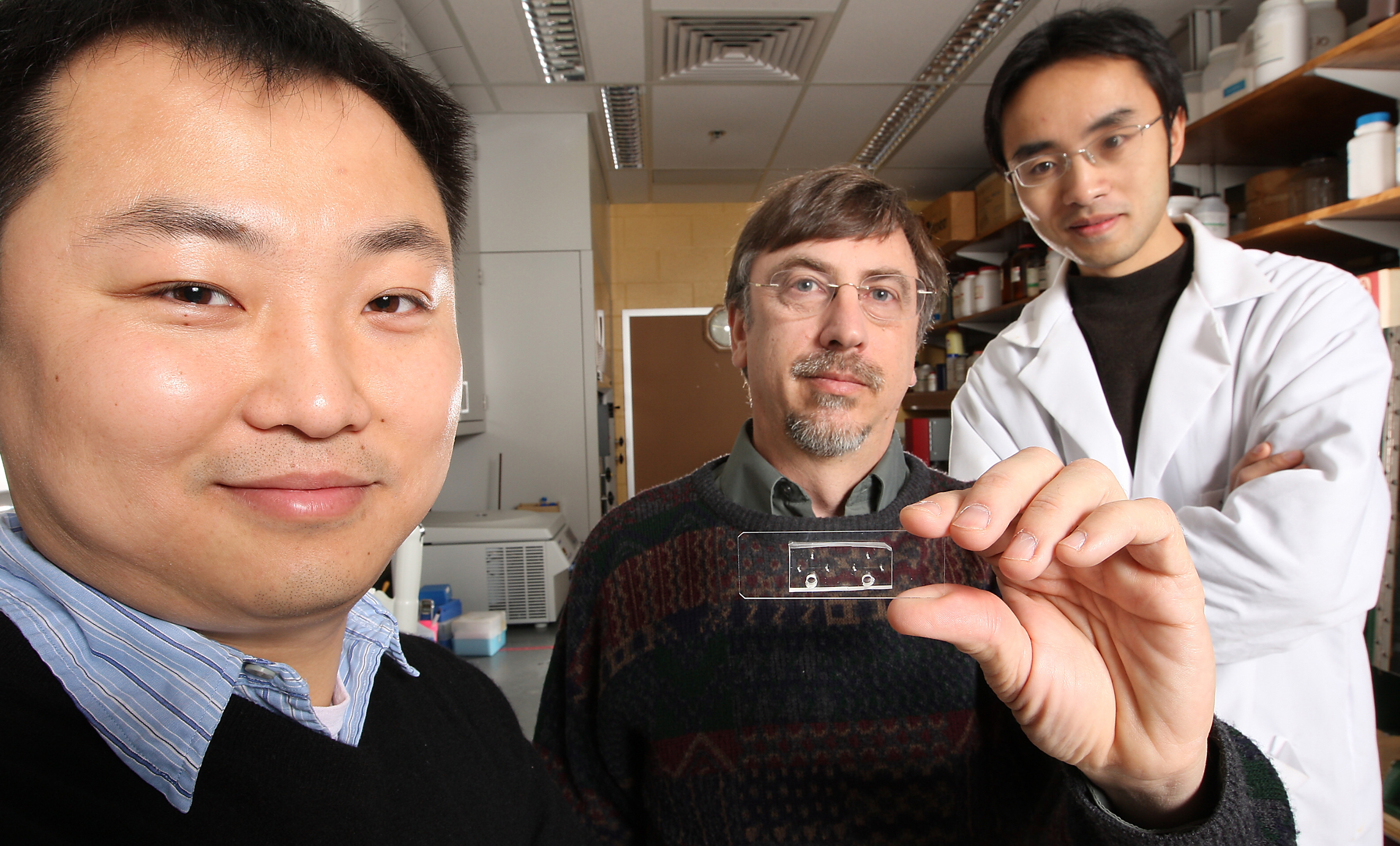 In a study published this month in Analytical Chemistry, Lu demonstrated that the technique can detect a handful of protein movements, or translocations, within entire populations of cells. These movements are important to detect because they are involved in many disease processes, such as oncogenesis, wherein a normal cell becomes malignant, said Robert Geahlen, a study co-author and researcher in the Department of Medicinal Chemistry and Molecular Pharmacology. "Protein translocations are involved in the activation of tumor cells," he said. "Detecting these movements could help diagnose the type and stage of cancer in the future." Lu's method uses two existing technologies: electroporation - used to determine protein location - and flow cytometry, a technique capable of rapidly examining individual cells but blind to intracellular protein locations on its own. The Purdue technique, called "electroporative flow cytometry," harnesses the discerning power of the first method with the speed of the second, Geahlen said. The method involves cells being sent through tiny channels within a microchip and undergoing electroporation, wherein electrical pulses open pores in cell membranes and protein is released from inside. Then, sensors measure protein concentrations. Since a protein's subcellular location can directly influence the amount of protein leaving the cell, as Lu and Geahlen have shown, this method is capable of indirectly determining location, Geahlen said. If proteins are in their original position, floating freely in the cell's interior, or cytoplasm, a large percentage of them will flow out of the cell upon electroporation, Lu said. If translocation has occurred, in which proteins migrate from the cytoplasm to tightly bind to the interior of the cell membrane, few will be able to leave. Previous technologies detect either protein movement in a few individual cells via slow imaging techniques or take average measurements from larger groups of cells, data usually irrelevant to protein location in individual cells, Lu said. "When looking at a few cells, you see the trees but not the forest," he said. "When you take average measurements from large groups, you see the forest but not the trees. Our method allows us to know something about each tree in the forest." The technology has the potential to be scaled up significantly, Lu said. In the study, 100-200 cells were processed per second, but that rate could potentially increase to speeds typical of flow cytometry, which goes through 10,000 cells per second. Speed increases can be achieved by optimizing the technology he said. The study examines the movement of a certain type of protein called kinases. Kinases and their translocations are important for activating and deactivating cells and sending signals to one another, Geahlen said. "There are many important kinases, enzymes and other proteins that become activated by translocation to the plasma membrane, and we've shown that we can detect one type of translocation," he said. "It's a first step." Lu has filed a provisional patent for the technique and said that he could see it being used in a clinical setting in five to 10 years. Study co-authors include graduate students Jun Wang, Leela Paris, Hsiang-Yu Wang, and postdoctoral researcher Ning Bao. Lu and Geahlen received funding from Purdue and the National Cancer Institute for the study. Lu plans to further develop the technology in the future. Writer: Douglas M. Main, (765) 496-2050, dmain@purdue.edu Sources: Chang Lu, 765-494-1188, changlu@purdue.edu Robert Geahlen, 765-494-1457, geahlen@pharmacy.purdue.edu