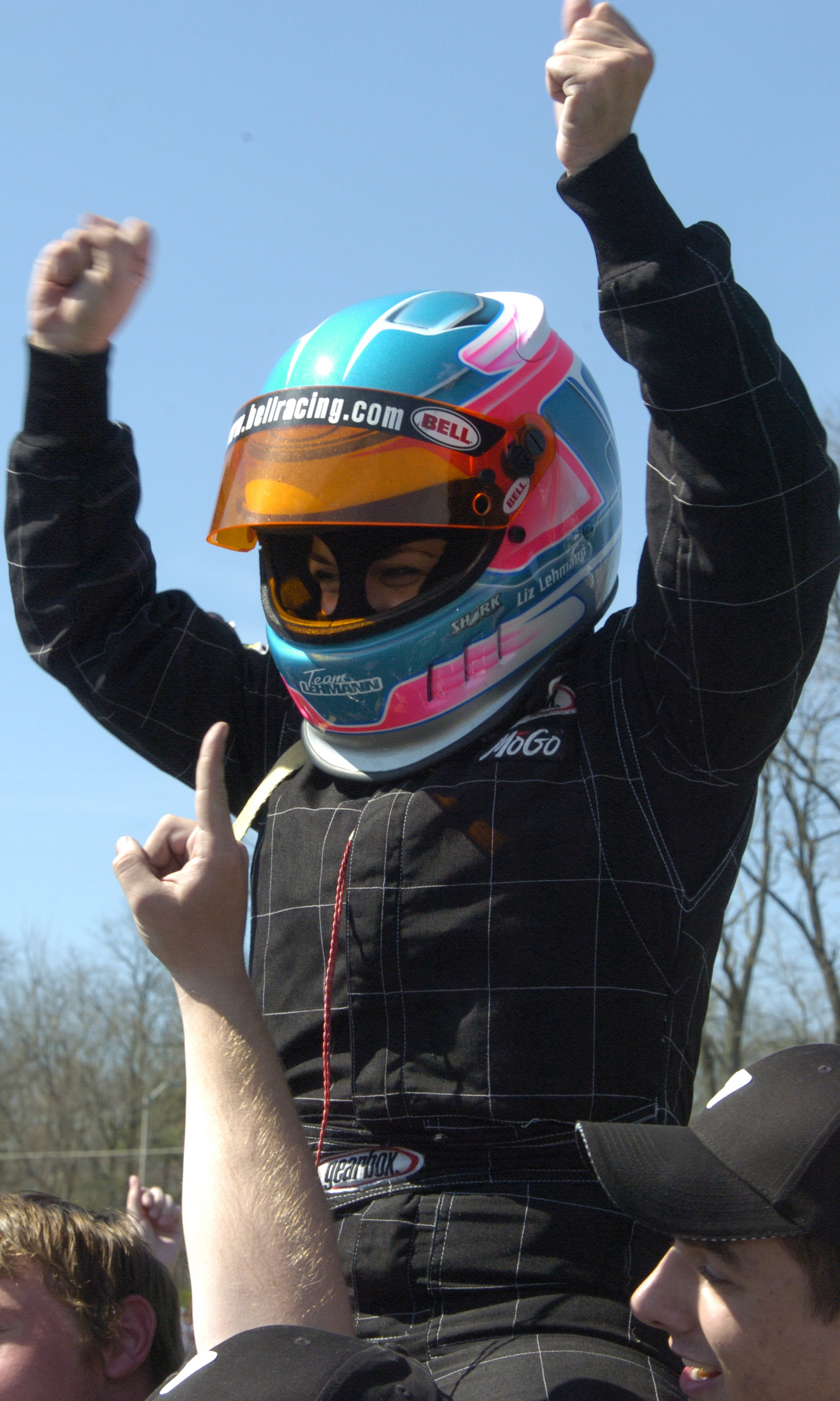 Purdue News Service: (765) 494-2096; purduenews@purdue.edu PHOTO CAPTION: Liz Lehmann, a junior majoring in management from Fort Wayne, is hoisted onto the shoulders of her teammates after winning the 50th Purdue Grand Prix on April 21, 2007. Lehmann, driving for the Purdue Motorsports Association, was the first female driver to win the 50-mile race. This year's race begins at 2:30 p.m. April 19, with driver introductions and the national anthem. Pits are open to the public from 9-10 a.m., and the track is open to the public at 10 a.m. Practice and sprint races continue until race time. (Purdue News Service photo/ J. Michael Willis) Publication-quality photo of last year's Grand Prix winner available at: https://www.purdue.edu/uns/images/+2008/grandprix-adv08.jpg Photo of grand marshal, Chris Foster available at: https://www.purdue.edu/uns/images/+2007/foster-chris07.jpg Note to Journalists: Media covering Grand Prix should check in at the ticket booth at the track to receive a media packet and credentials. For more information, contact Tanya Brown, Purdue News Service, at (765) 494-2079 or e-mail tanyabrown@purdue.edu To the News Service home page