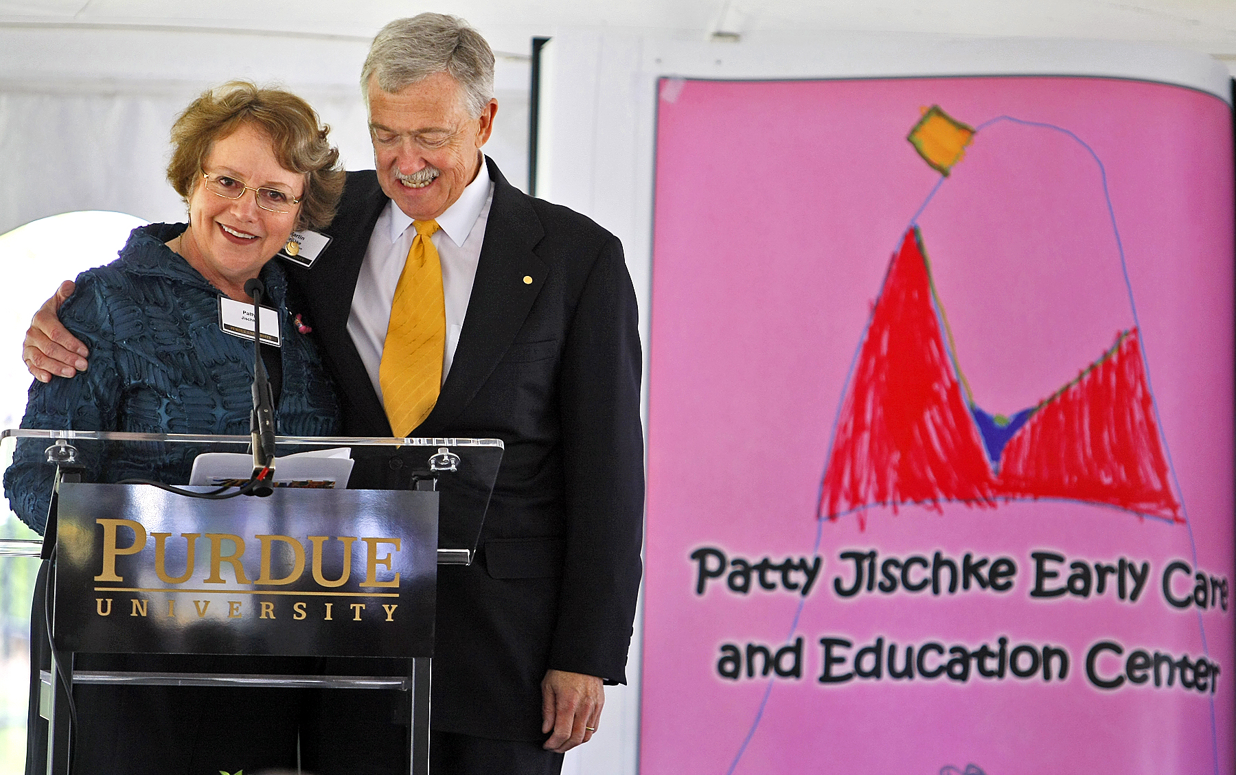Purdue News Service: (765) 494-2096; purduenews@purdue.edu Note to Journalists: Photos and video are available by contacting Greg McClure, Purdue News Service, at (765) 494-9394, gmcclure@purdue.edu Photo Caption: Patty Jischke addresses the crowd as she hugs her husband, former Purdue President Martin C. Jischke, after inviting him to join her on stage during Tuesday's (Sept. 30) dedication ceremony for the Patty Jischke Early Care and Education Center at Purdue. The $3.08 million center opened Aug. 11 and serves 86 children, ranging in age from 6 weeks to 5 years old. (Purdue News Service photo/Andrew Hancock) To the News Service home page