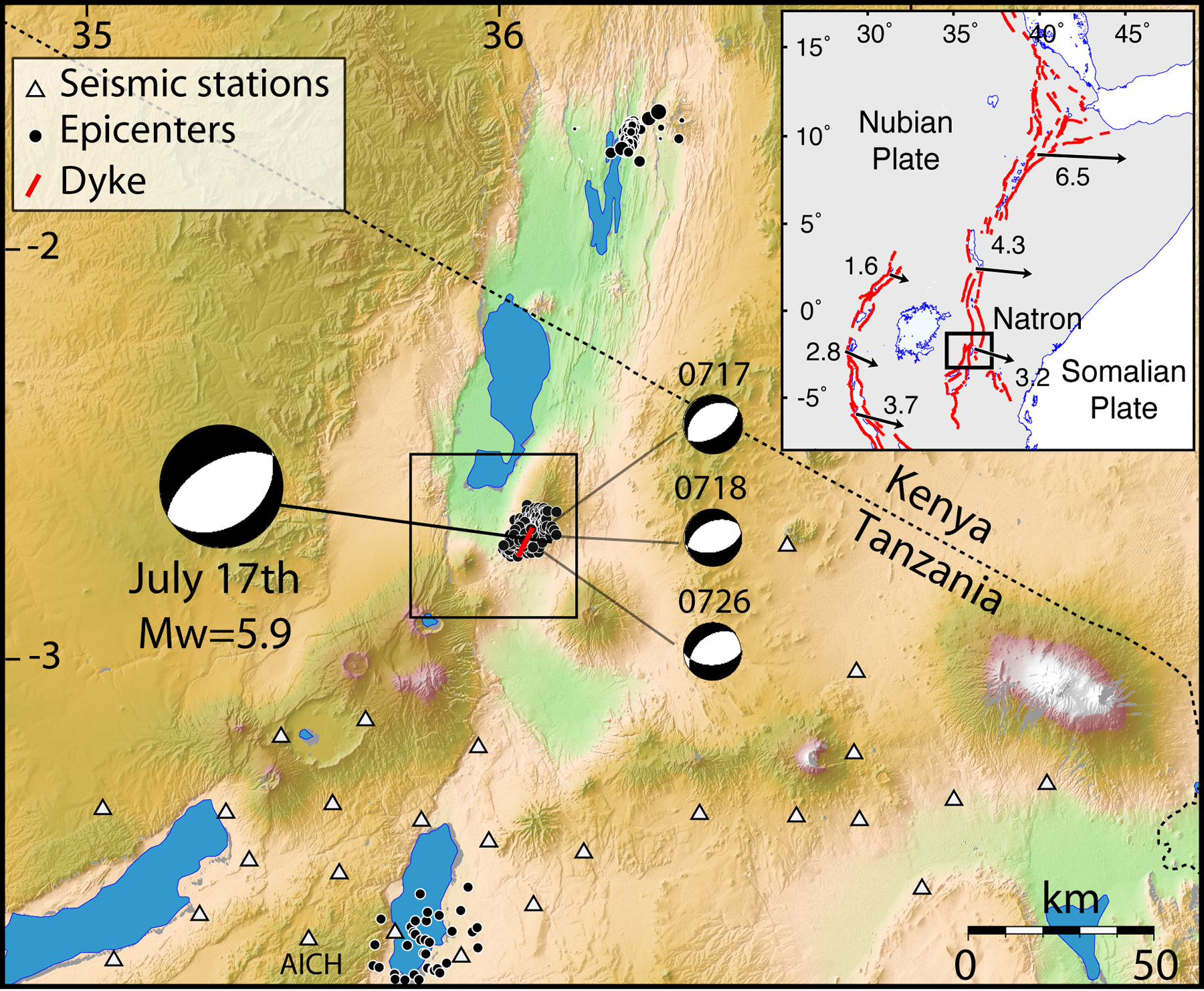"Such dyking events had been included in theories, but researchers had never before been in the right place at the right time with the right equipment to record them," Calais said. "The event was preceded by a slow slipping of the tectonic plates along a fault line. This also had not been seen before. Faults usually slip suddenly, which produces earthquakes, but this was a very seismically quiet course of events that lasted about one week." The existence of these events provides a key element of how the Earth's rigid outer shell - the lithosphere - breaks apart and moves. The known forces pushing and pulling on continents are not powerful enough to break them apart. However, repeated dyking events could weaken the lithosphere severalfold, allowing it to shift and break under far less force, Calais said. "To break a continent apart, one needs to overcome the strength of the Earth's lithosphere," he said. "But when we calculate the forces available from plate tectonics, we find that they are not large enough to do the job. We know that continents break apart and have done so repeatedly in the geological past. So, how can it happen? One way is to add a little push to the system, and this is exactly what dyke intrusions do." During a dyke intrusion, magma held in deep reservoirs breaks through surrounding rock and rises toward the surface, forcing the two plates apart, and, over time, weakening the lithosphere by transferring heat to the surrounding rocks. The magma fills and widens cracks and fractures as it rises. The end result is a vertical wall, or dyke, of magma that has pushed the Earth's crust apart, he said. "Eventually, if these events occur over and over again for millions of years, an ocean will form between the two plates," he said. "So, today in Tanzania, we are really witnessing the earliest stages of ocean formation." Calais and his collaborators captured this event in Tanzania's Lake Natron basin during the summer of 2007. The basin lies near the southern tip of the eastern branch of the East African Rift, the area where the Somalia and Nubia tectonic plates are moving apart. Reports of a series of moderate earthquakes from northern Tanzania felt all the way to Nairobi in Kenya caught the team's attention. French collaborators had installed seismographs in the vicinity of the Natron basin a few months before the event and recorded more than 600 small earthquakes in two weeks, pinpointing the center of the tectonic activity. Tanzanian researchers were able to collect Global Positioning System (GPS) measurements in the Natron area. Calais compared these measurements with those taken earlier to determine the amount of displacement of the Earth's surface. But these displacements did not match what was expected from the earthquakes. "The displacement was much too large given the small size of the earthquakes, which was the first lead that something unusual was happening," Calais said. "Soon after these earthquakes, one of the volcanoes in the area entered an explosive eruptive stage, which indicated that magma was involved. So we had an idea this might be a dyking event." He then worked with colleagues in Luxembourg to obtain radar interferometry (InSAR) data, which provided a detailed picture of ground movements. A team of led by Belgium scientists went to the area for a field check and mapped 13 miles of open fissures that corresponded well with the observations from InSAR data. "Once we had all of the measurements, in particular the InSAR data, we knew that the combined dataset could only be explained by the injection of a dyke," Calais said. "If we had only the GPS data and/or seismic activity data, this would have been difficult to prove. We needed all of these methods to really understand what was happening." A dyking event is mostly an aseismic process, meaning it does not create large earthquakes or release a lot of ground-shaking energy. It would be easy to miss such an occurrence without some of the advanced geodetic measurement technology available today, he said. "When you look at events like this with only one measurement tool, you are half blind," Calais said. "You are missing a lot of what the planet is telling us. Sometimes it whispers instead of shouting." It is possible that there have been several dyking events on the East African Rift within the past few decades, he said. "If there is evidence that these events have been happening within recent time, there is no reason not to believe that they have been happening for several million years," Calais said. "This could then be a very important contribution to the dynamics of the East African Rift system." Co-authors of the paper include Nicolas d'Oreye and Anneleen Oyen from the National Museum of Natural History in Luxembourg; Julie Albaric, Jacques Déverchère and Julie Perrot from the University of Brest in France; Anne Deschamps from the National Center for Scientific Research in France; Damien Delvaux, Francois Kervyn, Benoit Smets and Christelle Wauthier from the Royal Museum for Central Africa in Belgium; Cynthia Ebinger from the University of Rochester; Richard W. Ferdinand from the University of Dar es Salaam in Tanzania; Athanas S. Macheyeki from the Renard Centre of Marine Geology in Belgium; Elifuraha Saria from Ardhi University in Tanzania; and D. Sarah Stamps from Purdue. Calais and his collaborators next will watch the surrounding area for the aftermath of this dyking event. "When a large event like this occurs, the state of stress on the Earth's upper layers are changed, and we expect several additional events to follow," Calais said. "Other magma reservoirs may be touched and trigger another dyking event. It will take a while for the system to relax again and get back to its quiet, steady-state, behavior." His team also plans to examine the area in more detail to try to discover evidence of past dyking events. This information could illustrate any historical patterns in the incidences of these ev