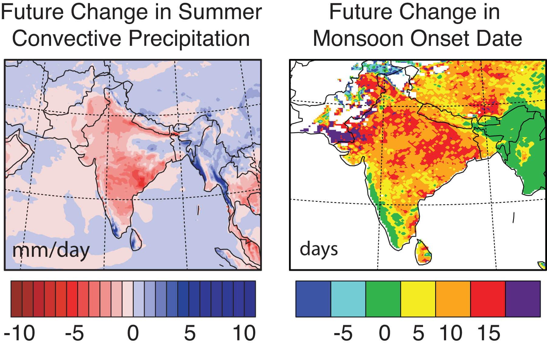 Moetasim Ashfaq1*, Ying Shi 2, Wen-wen Tung1, Robert J. Trapp1, Xueijie Gao2, Jeremy S. Pal We used a high-resolution nested climate modeling system to investigate the response of South Asian summer monsoon dynamics to anthropogenic increases in greenhouse gas concentrations. The simulated dynamical features of the summer monsoon compared well with reanalysis data and observations. Further, we found that enhanced greenhouse forcing resulted in overall suppression of summer precipitation, a delay in monsoon onset, and an increase in the occurrence of monsoon break periods. Weakening of the large-scale monsoon flow and suppression of the dominant intraseasonal oscillatory modes were instrumental in the overall weakening of the South Asian summer monsoon. Such changes in monsoon dynamics could have substantial impacts by decreasing summer precipitation in key areas of South Asia.