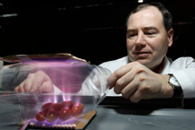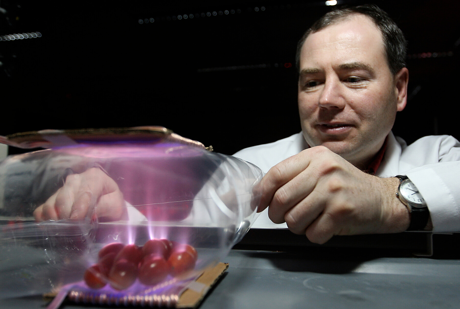 Kevin Keener designed a device consisting of a set of high-voltage coils attached to a small transformer that generates a room-temperature plasma field inside a package, ionizing the gases inside. The process kills harmful bacteria such as E. coli and salmonella, which have caused major public health concerns. Keener's process is outlined in an article released online early in LWT - Food Science and Technology, a journal for the Swiss Society of Food and Technology and the International Union of Food Science and Technology. "Conceptually, we can put any kind of packaged food we want in there," said Keener, an associate professor in the Department of Food Science. "So far, it has worked on spinach and tomatoes, but it could work on any type of produce or other food." By placing two high-voltage, low-watt coils on the outside of a sealed food package, a plasma field is formed. In the plasma field, which is a charged cloud of gas, oxygen has been ionized and turned into ozone. Treatment times range from 30 seconds to about five minutes, Keener said. Ozone kills bacteria such as E. coli and salmonella. The longer the gas in the package remains ionized, the more bacteria that are killed. Eventually, the ionized gas will revert back to its original composition. The process uses only 30-40 watts of electricity, less than most incandescent light bulbs. The outside of the container only increases a few degrees in temperature, so its contents are not cooked or otherwise altered. Other methods of ozone treatment require adding devices to bags before sealing them to create ozone or pumping ozone into a bag and then sealing it. Keener's method creates the ozone in the already sealed package, eliminating any opportunity for contaminants to enter while ozone is created. "It's kind of like charging a battery. We're charging that sample," Keener said. "We're doing it without electrode intrusion. We're not sticking a probe in the package. We can do this in a sealed package." Keener said testing has worked with glass containers, flexible plastic-like food-storage bags and rigid plastics, such as strawberry cartons and pill bottles. He said the technology also could work to ensure pharmaceuticals are free from bacteria. According to the Centers for Disease Control and Prevention, about 40,000 cases of Salmonellosis, an infection caused by salmonella, are reported each year in the United States, causing 400 deaths. The CDC reports that about 70,000 E. coli infections are reported each year, causing dozens of deaths. Funding for Keener's research came from Purdue Agriculture. A patent on the technology is pending. Keener said the next step is to develop a commercial prototype of the device that could work on large quantities of food. Writer: Brian Wallheimer, (765) 496-2050, bwallhei@purdue.edu Source: Kevin Keener, (765) 494-6648, kkeener@purdue.edu