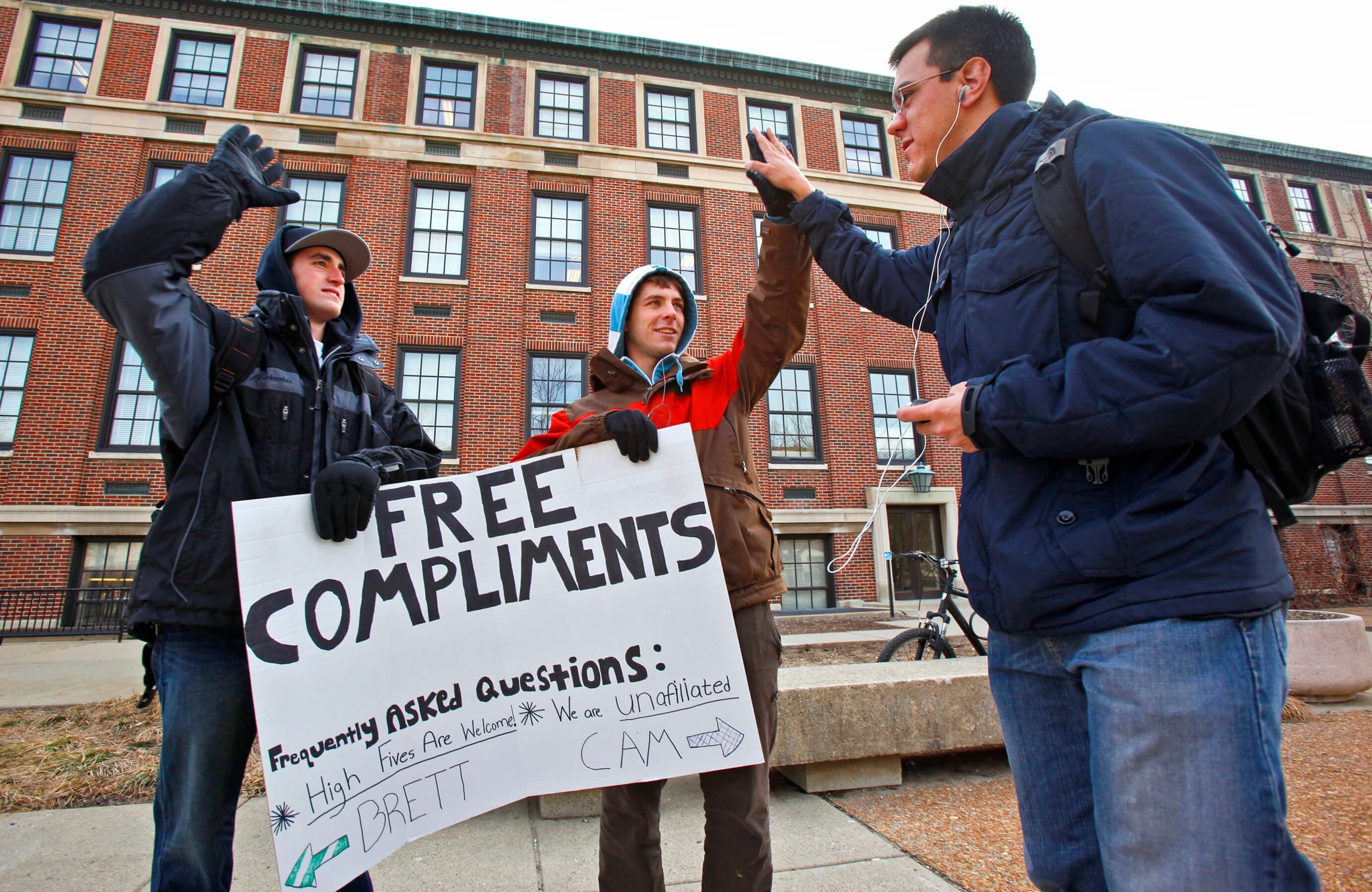 Brett Westcott, a sophomore in civil engineering from Plainfield, Ill., and Cameron Brown, a sophomore in business management from Toledo, Ohio, stand on a prominent walkway at the center of campus every Wednesday and offer compliments to hundreds of passersby. Westcott said he woke up with the idea at the beginning of the school year and quickly recruited his friend Brown. "I love giving free compliments – there's nothing else I'd rather do," Westcott said. "The first day I was a little bit nervous because I wasn't sure how people were going to take it. But we've had a good response." Westcott says the pair has given thousands of free compliments, sometimes requiring quick thinking and machine-gun delivery during busy passing periods. Typical objects of praise are people's shoes, pants, jackets, hats, sunglasses, scarves, backpacks, hairstyles and smiles.