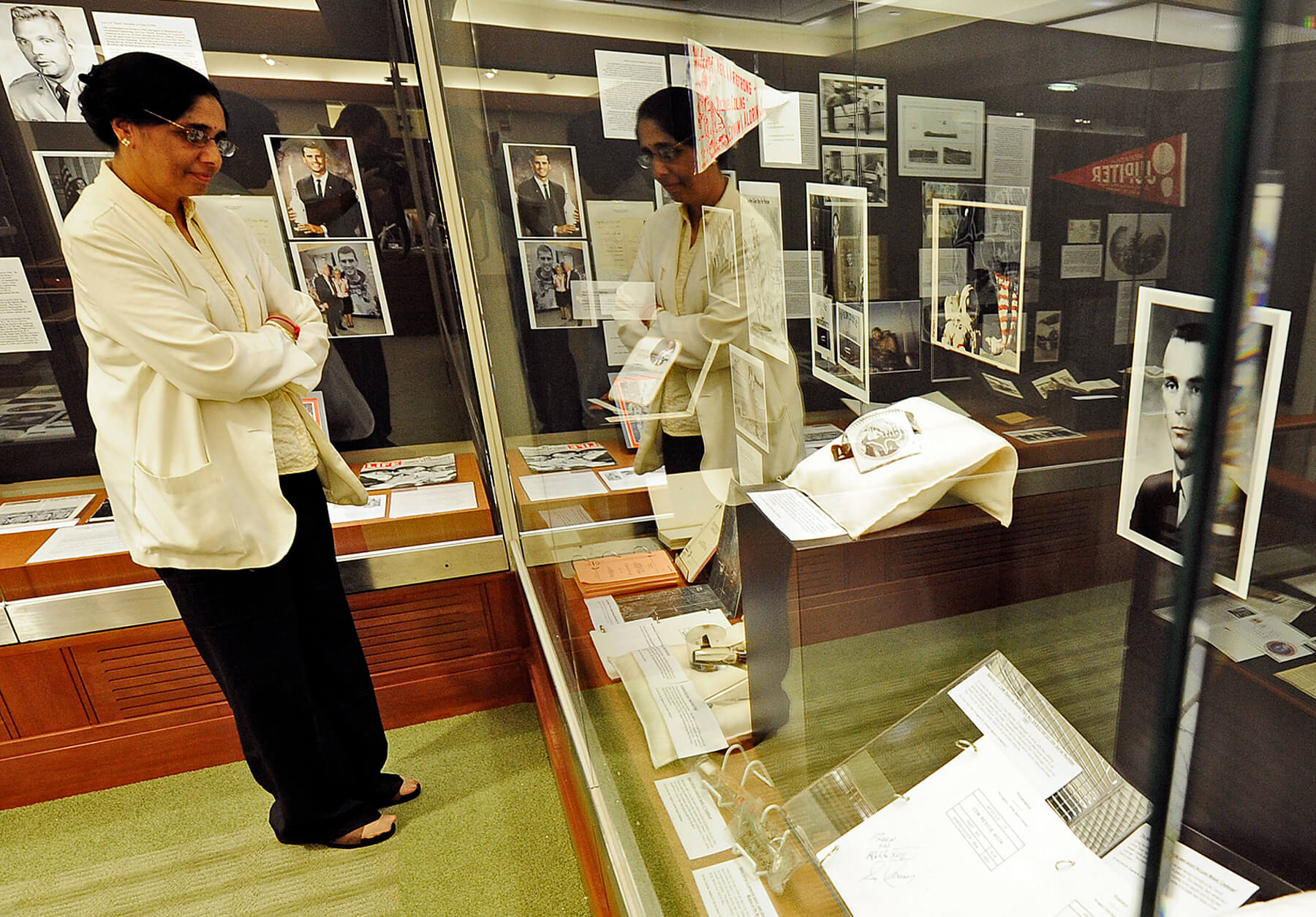 Jyoti Iyer Mathur, the educational programs coordinator for Purdue's Computing Research Institute, views artifacts at the Purdue Libraries' Archives and Special Collections exhibit "Purdue's Place in Space: From the Midwest to the Moon" on Monday (July 20). The exhibit, celebrating Purdue's rich tradition in space travel and the 40th anniversary of alumnus Neil Armstrong's lunar landing, opened Monday and runs through Oct. 30 in the Virginia Kelly Karnes Archives and Special Collections Research Center on campus. Armstrong, the first person to walk on the moon, and alumnus Eugene Cernan, the most recent person to do so, have donated personal papers to the university.