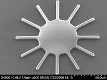 Because the devices, called resonators, vibrate in specific patterns, they are able to cancel out signals having certain frequencies and allow others to pass. The result is a new type of "band-pass" filter, a component commonly used in electronics to permit some signals to pass through a cell phone's circuitry while blocking others, said Jeffrey Rhoads, an assistant professor of mechanical engineering at Purdue University. Such filters are critical for cell phones and other portable electronics because they allow devices to process signals with minimal interference and maximum transmission efficiency. The new technology represents a potential way to further miniaturize band-pass filters while improving their performance and reducing power use, Rhoads said. The device is an example of a microelectromechanical system, or a MEMS, which contain tiny moving parts. Incoming signals generate voltage that produces an electrostatic force, causing the MEMS filters to vibrate. Researchers have proposed linking tiny beams in straight chains, but Rhoads has pursued a different approach, arranging the structures in rings and other shapes, or "non-traditional coupling arrangements." One prototype, which resembles spokes attached to a wheel's hub, is about 160 microns in diameter, or comparable in size to a grain of sand.