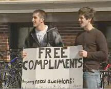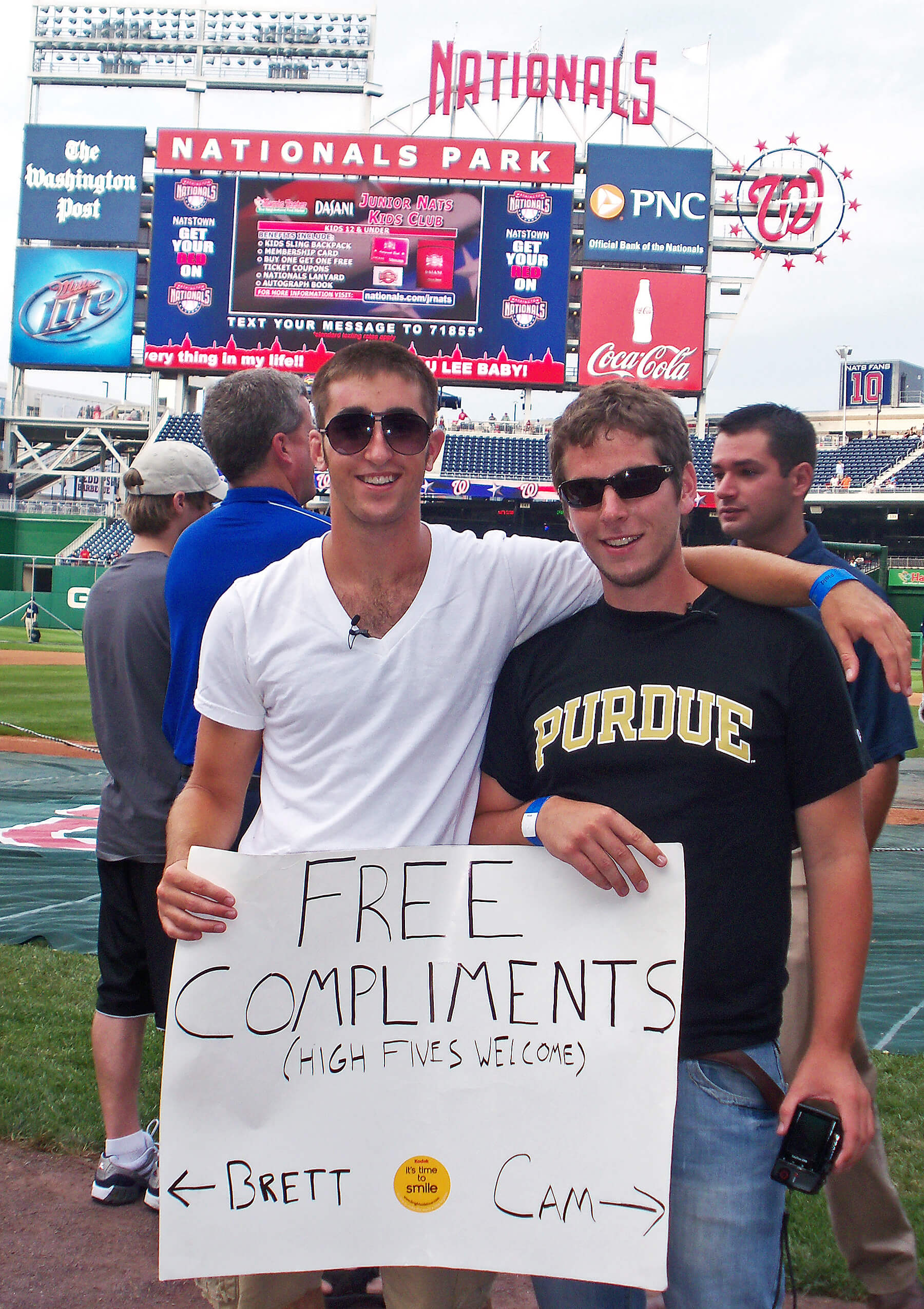 The Purdue "Compliment Guys" have appeared on "Good Morning America," "Fox & Friends" and "Today," and have been featured in newspapers that include The New York Times, Chicago Tribune and Los Angeles Times. The duo recently completed a Kodak-sponsored national tour that allowed them to deliver compliments from New Orleans to New York. This week's compliments session marks one year since the first Wednesday that Westcott, a civil engineering student from Plainfield, Ill., first ventured out to give compliments to strangers. "I just wanted to make my part of the world a slightly better place to live in," Westcott said. "I never imagined the impact this simple idea would have across the nation." Cameron Brown, a management student from Toledo, joins Westcott every Wednesday in front of Wetherill Laboratory of Chemistry. "It's never hard to think of a compliment; there is something good in everyone. It just takes a second to look," Brown said. "Giving compliments is the highlight of my week. It's been encouraging to see others begin to do the same." Writer: Jim Schenke, (765) 494-6262, jschenke@purdue.edu Sources: Brett Westcott, bwestcot@purdue.edu Cameron Brown, cebrown@purdue.edu
