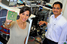 PHOTO CAPTION: Researchers have determined precisely how fluid boils in tiny "microchannels," creating formulas and models that will help engineers design systems to cool high-power electronics in electric and hybrid cars, aircraft, computers, and other applications. Here, Purdue University doctoral student Tannaz Harirchian holds up special chips provided by Delphi Electronics and Safety that she and Professor Suresh Garimella used to simulate what happens in a real chip. (Purdue News Service photo/Andrew Hancock) A publication-quality photo is available at https://www.purdue.edu/uns/images/+2009/garimella-boiling.jpg