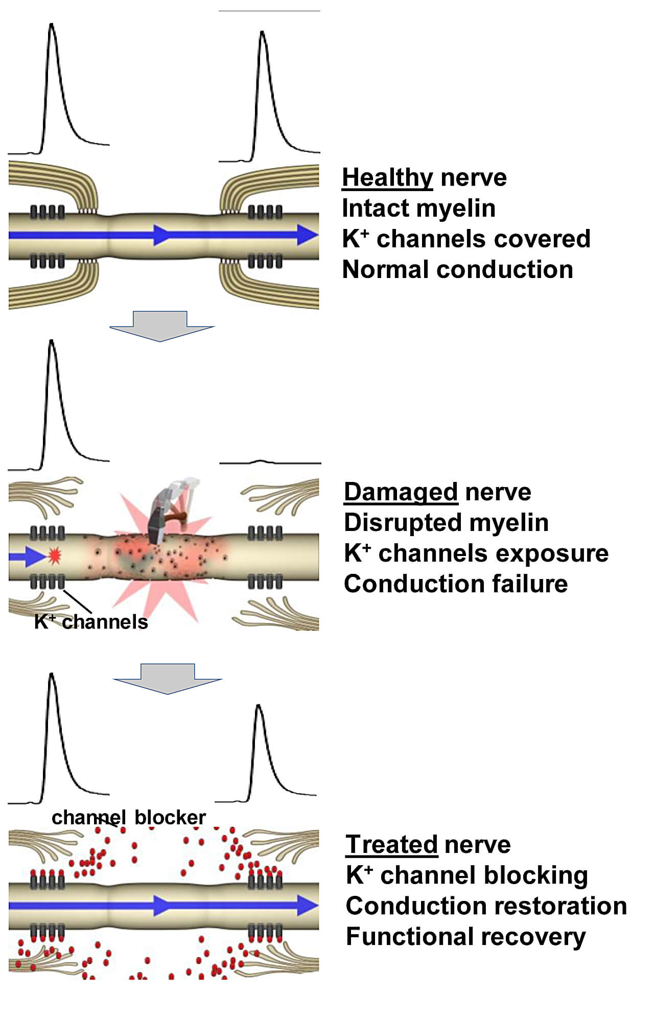 Wenjing Sun†, Daniel Smith*, Yan Fu‡, Ji-Xin Cheng‡, Steven Byrn*, Richard Borgens‡, and Riyi Shi†‡ †Department of Basic Medical Sciences, Center for Paralysis Research ‡Weldon School of Biomedical Engineering *Department of Industrial and Physical Pharmacy Purdue University We have demonstrated that 4-AP-3-MeOH, a 4-aminopyridine derivative, significantly restores axonal conduction in stretched spinal cord white mater strips and shows no preference in restoring large and small axons. This compound is 10 times more potent when compared to 4-AP and other derivatives in restoring axonal conduction. Unlike 4-AP, 4-AP-3-MeOH can restore axonal conduction without changing axonal electrophysiological properties. In addition, we also have confirmed that 4-AP-3-MeOH is indeed an effective blocker of IA based on patch clamp studies using guinea pig dorsal root ganglia cells. Furthermore, we have also provided the critical evidence to confirm the unmasking of potassium channels following mechanical injury. Taken together, our data further support and implicates the role of potassium channels in conduction loss and its therapeutic value as an effective target for intervention to restore function in spinal cord trauma. Furthermore, due to its high potency and possible low side effect of impacting electrophysiological properties, 4-AP-3-MeOH is perhaps the optimal choice in reversing conduction block in spinal cord injury compared to other derivatives previously reported from this group.