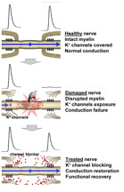 The chemical compound also might be developed as a treatment for multiple sclerosis. Because nerves usually are not severed in a common type of spinal cord trauma, called "compression" injuries, the drug offers hope as a possible treatment, said Riyi Shi, a professor in Purdue University's Department of Basic Medical Sciences, School of Veterinary Medicine, Center for Paralysis Research and Weldon School of Biomedical Engineering. "Compression is responsible for most spinal cord injuries, including many resulting in paralysis," Shi said. "Since the nerves are not severed, this type of drug represents a potential golden opportunity to treat spinal cord injuries." The experimental compound, 4-aminopyridine-3-methyl hydroxide, has been shown to restore function to damaged axons, slender fibers that extend from nerve cells and transmit electrical impulses in the spinal cord. Findings, based on experiments with guinea pig spinal cord tissue, appeared online Wednesday (Nov. 18) in the Journal of Neurophysiology. The work was led by Department of Basic Medical Sciences doctoral student Wenjing Sun. Shi said the findings were made possible by the interdisciplinary nature of the work, which also involves researchers Richard Borgens, director of Purdue's Center for Paralysis Research and the Mari Hulman George Professor of Neurology in the School of Veterinary Medicine; Stephen Byrn, the Charles B. Jordan Professor of Medicinal Chemistry, and Daniel Smith, a research assistant professor, both in the Department of Industrial and Physical Pharmacy; and Ji-Xin Cheng, an associate professor in the Weldon School of Biomedical Engineering and Department of Chemistry. The researchers subjected spinal cord tissue to stresses that mimic what happens in a compression injury, which stretches nerves. Then they treated the damaged axons with 4-aminopyridine-3-methyl hydroxide. The compound is a derivative of the drug 4-aminopyridine, used primarily as a research tool and also to manage symptoms of multiple sclerosis. The axons of each nerve are sheathed in a thick insulating lipid layer, called myelin, which enables the transmission of signals without short circuiting, much like the insulation surrounding electrical wires. Spinal cord trauma damages the myelin sheath, exposing "fast potassium channels" that are embedded in the axons and are critical for transmitting nerve impulses. The researchers confirmed previous circumstantial evidence suggesting injury causes the myelin insulation to recede, exposing the channels and impairing signal transmission. Laboratory and imaging techniques revealed the exposed channels in damaged axons. The researchers also discovered that 4-aminopyridine-3-methyl hydroxide is a "potassium channel blocker," using a sophistic laboratory technique called "patch clamp" to measure signal conduction. Findings confirmed that the compound prevents the exposed channels from leaking electrical current and enhances nerve conduction in segments of the damaged spinal cord. The compound could make it possible to sidestep spinal cord damage by enabling axons to transmit signals as though they were still sheathed in myelin, Shi said. Nerves transmit signals through a series of rapid electrical pulses, or "action potentials." For proper nerve function, the time gap between pulses must be as brief as possible. However, 4-aminopyridine has been shown to lengthen the gap, or "refractory period," between pulses. The researchers found that 4-aminopyridine-3-methyl hydroxide restores function without affecting the refractory period. As a result, the damaged nerves perform more like healthy nerves than those treated with other drugs, he said. Another key advantage of the new compound is that it's about 10 times more potent than 4-aminopyridine, meaning lower doses can be used to reduce the likelihood of serious side effects. Because myelin also is damaged in multiple sclerosis, the same drug might be used to restore nerve function in people stricken with the disease, Shi said. Since the newer drug can be used in lower doses, it might be more effective than 4-aminopyridine in treating multiple sclerosis, which affects more than 350,000 people in the United States and 2 million worldwide, he said. The research has been funded by the Purdue Research Foundation and the National Institutes of Health. The Journal of Neurophysiology paper was written by Sun, doctoral student Yan Fu in the School of Biomedical Engineering, Smith, Cheng, Byrn, Borgens and Shi. Writer: Emil Venere, 765-494-4709, venere@purdue.edu Source: Riyi Shi, 765-496-3018, riyi@purdue.edu