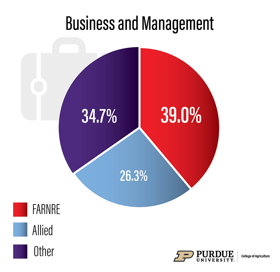 The Business and Management cluster includes business and management occupations throughout all stages of the food and agriculture value chain, from agricultural inputs and production to food wholesaling and distribution, including the management of renewable natural resources. It represents about 41% of openings.