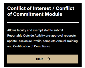 Reportable Outside Activities must be approved on an annual basis in order to ensure that a Conflict of Commitment doesn’t arise due to a change in either your other outside activities or other issues involving your responsibilities to the University.