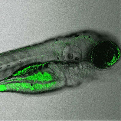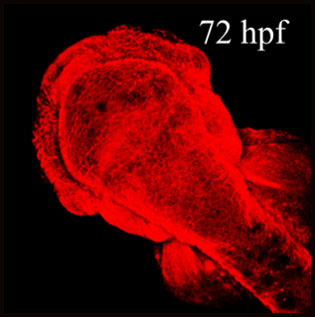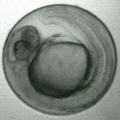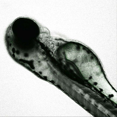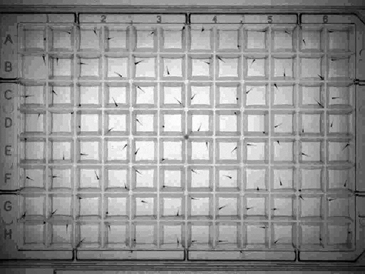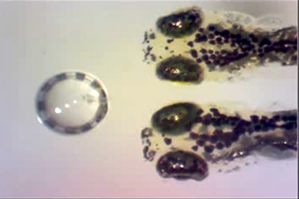 We can evaluate visual performance of zebrafish larvae by their visual responses. In this movie, a normal one (top) and a mutant one (bottom) are placed in a machine with black-and-white strips (reflection in the air bubble on the left). These strips are rotating vertically in front of the larvae. The mutant one with retinal degeneration cannot see well and does not move their eyes to track the strips movement.